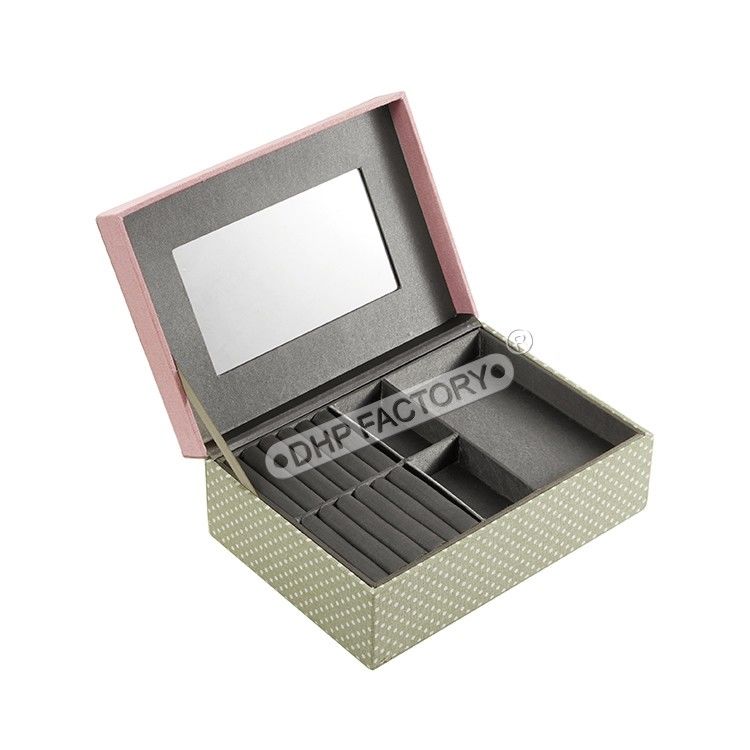 This luxury jewelry fabric rigid box features a flap lid, ribbon closure, and custom foil logo. The built-in mirror and soft lining enhance product display and protection. Made from premium rigid board and fabric material, it is ideal for high-end jewelry gifting, branding, and secure packaging.